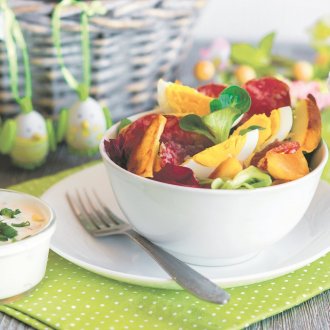 Krompir oguliti, iseći na komade, pa pržiti na ulju na umerenoj vatri dok ne porumeni sa svih strana. Ocediti od viška ulja i staviti u činiju. Jaja tvrdo skuvati, prohladiti, oljuštiti, iseći na komade i dodati krompiru. Ubaciti iscepkane listove zelene salate, spanać i tanko sečenu čajnu kobasicu. Pomešati jogurt, malo maslinovog ulja, senf, med, so, biber i peršun, preliti salatu i poslužiti.