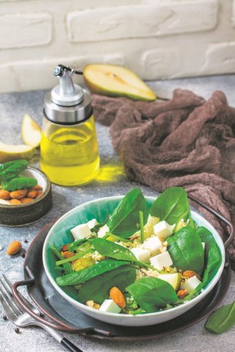 Kuskus pomešati sa malo maslinovog ulja, posoliti i pobiberiti, pa staviti u činiju. Dodati spanać, grubo usitnjene bademe, iseckane kruške i na kockice isečenu fetu. Preliti maslinovim uljem i sokom od limuna, promešati i odmah poslužiti.
