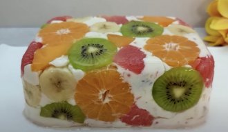 Zatim pomešajte 8g agar-agar i 50ml vode i zagrejte, pa dodajte 350ml mleka i 200g kondenzovanog mleka, pa kuvajte 1-2 minuta. Sklonite sa vatre, pa dodajte 200g jogurta. U tu smesu sipajte ostatak voća, dobro promešajte, pa prespite u činiju. Stavite u frižider i držite sve dok se dobro ne stegne.