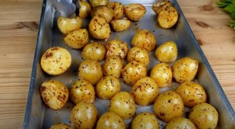 Na pola pečenje, posle 10 minuta, okrenite krompir i pecite do kraja.
