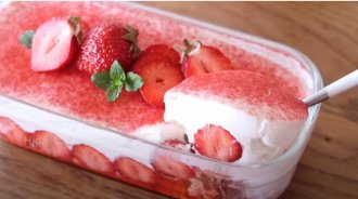 Dodajte i jagode (ali malo sirupa ostavite sa strane za keks), pa lagano umešajte. U vatrostalnu posudu poređajte keks, pa prelijte sirupom od jagoda. Po ivici poređajte jagode isečene na polutke i preko sipajte beli fil.