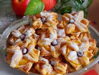 Tanko razviti lisnato testo i iseći na veće kvadrate. Jabuke oguliti izvaditi sredinu i iseći na tanje krugove. U sredinu testa staviti jabuku pa saviti trouglove testa i spojiti u krug jabuke i pritisnuti. U sredinu staviti po jednu višnju.