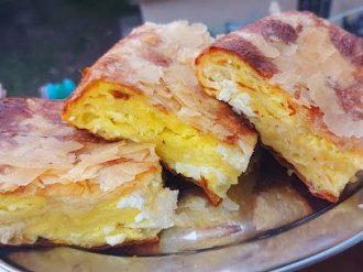 Sipati kutlačom nadev, pa izrendati kačkavalj. Ponovo rezance, nadev kačkavalj. Peći gibancu na 200 stepeni 40-45 minuta.