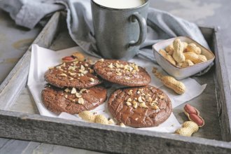 Čokoladu otopiti na pari sa maslacem. Jaja pet minuta mutiti mikserom sa šećerom, vanilom, praškom za pecivo i malo soli. Umešati smesu od čokolade, dodati brašno pomešano sa kakaom, sve dobro sjediniti, te dodati polovinu iseckanog kikirikija. Formirati keksiće na plehu obloženom papirom za pečenje i peći u rerni na 175 stepeni desetak minuta. Preliti sosom od čokolade, posuti preostalim kikirikijem, prohladiti i poslužiti.