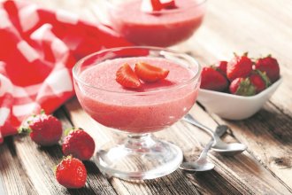 U manju šerpu staviti jagode i šećer i kada provri ostaviti na tihoj vatri da se šećer istopi a jagode omekšaju i puste sokove. Skloniti sa vatre i štapnim blenderom usitniti da se dobije pire. U drugoj posudi pomešati žumanca, pirinčano mleko mleko i gustin. Promešati tako da se sve sjedini i dobije homogena masa bez grudvica.Uzeti nekoliko kašika vrućeg prea od jagoda i prebaciti uz mešanje u posudu sa žumancima, mlekom i gustinom, savetuje Lepi Brka. Sada sve to uz neprekidno mešanje sipati u pire od jagoda i vratiti na tihu vatru. Neprekidno mešati žicom sve dok ne proključa. Skloniti sa vatre, dodati maslac i vanilin šećer, nastaviti mešanje dok se maslac ne istopi i presuti u posude za serviranje. Ostaviti da se ohladi do sobne temperture, a nakon toga staviti u frižider da se hladi. Servirati dekorisano jagodama.