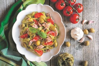 Taljatele skuvati u slanoj, ključaloj vodi, prema uputstvu sa pakovanja. Ocediti i staviti u adekvatnu činiju. Dodati oceđenu tunjevinu, maslinke, čeri paradajz, izgnječen beli luk, bosiljak, maslinovo ulje, sok od limuna, so i biber, te sve dobro promešati. Odmah poslužiti.
