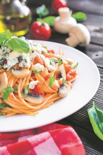 Špagete skuvati u slanoj, ključaloj vodi, prema uputstvu sa pakovanja. U većem tiganju na zagrejanom ulju propržiti iseckan crni luk, pa dodati izgnječen beli luk i mešati još minut. Zatim ubaciti na listiće isečene šampinjone, posoliti i pobiberiti, te mešati dok ne ispari višak tečnosti. Dodati usitnjeni pelat, origano i bosiljak, kuvati dok ne proključa, pa smanjiti vatru i lagano krčkati još 20 minuta. Dodati oceđene špagete, posuti izmrvljenom gorgonzolom i poslužiti dok je toplo.