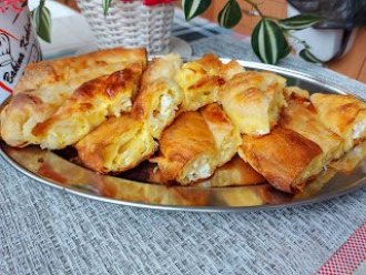 Pokriti folijom da odmore 15 minuta. Sto pobrašnjiviti, pa razvlačiti jednu po jednu lopticu. Pokidati krajeve. Izdrobiti sir i izjednačiti sa jajima i mlekom. Nafilovati testo i uviti u rolnice.