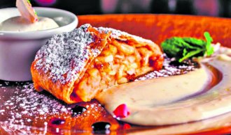 Rastanjite lisnato testo. Na sredinu kore stavite rendane jabuke pomešane sa šećerom, limunovim sokom, suvim grožđem, orasima i vanilin-šećerom.