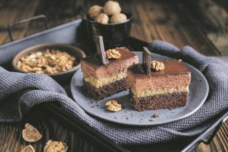 Umutiti četiri jajeta sa 150 grama maslaca i 150 grama šećera, pa dodati 120 grama oraha, kašiku kakao-praha i brašno pomešano sa praškom za pecivo. Sve dobro sjediniti, izliti u pleh i peći u rerni na 200 stepeni 20 minuta. Ohladiti i premazati džemom. Preostale orahe pomešati sa rumom i 100 grama šećera, te rasporediti preko džema. Preostala jaja mešati na pari sa preostalim šećerom, pa dodati kakao i skloniti sa vatre. Prohladiti i izmiksati sa preostalim maslacem. Rasporediti preko fila od oraha, odozgo preliti glazurom od čokolade i ulja, ohladiti i poslužiti.