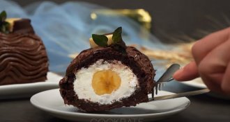 Zatim bananu isecite na kolutove, do pola umučite u istopljenu mlečnu čokoladu, pa poređajte na vrh rolata. Ukrasite mentom. Prijatno!