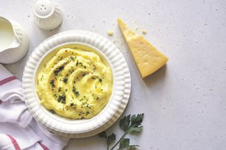 Krompir oguliti, iseći na krupnije komade, staviti u šerpu, naliti vodom i kuvati 25-30 minuta, da omekša. Ocediti, dodati mleko, izgnječen beli luk, maslac, pavlaku za kuvanje, parmezan, so i biber, pa sve dobro izmiksati. Poslužiti dok je toplo.
