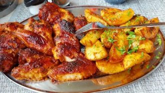 Pleh obložiti pek papirom i poređati krilca i u to dodati krompiriće, pa izmešati u ostatku sosa. Malo posoliti i dodati ulja i staviti krompir u pleh.