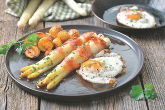 Mlade krompiriće očistiti, prepoloviti i pržiti na maslinovom ulju 10-15 minuta uz mešanje. Ocediti i staviti sa strane, a na istoj masnoći ispržiti dva jajeta na oko. Špargle oprati, prosušiti, odstraniti im donje, tvrde delove, pa uzimati po tri komada i uviti u po dve šnite tanko sečene slanine. Posoliti i pobiberiti, te kratko propržiti u tiganju na umerenoj vatri, da slanina porumeni, a špargle omekšaju. Posoliti, pobiberiti, začiniti iseckanim vlašcem i peršunom, te poslužiti uz krompiriće i jaja.