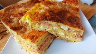 Na drugi red staviti malo šunke i tako redom do utroška. Pokriti korom premazati uljem i peći na 200 stepeni 50 minuta.