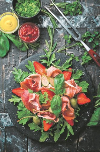 Rukolu oprati, prosušiti, staviti u činiju, pa dodati tanko sečenu pršutu, iseckane jagode i oceđeni kapar. Preliti maslinovim uljem i balzamiko sirćetom, začiniti listićima svežeg bosiljka i nane, promešati i odmah poslužiti.