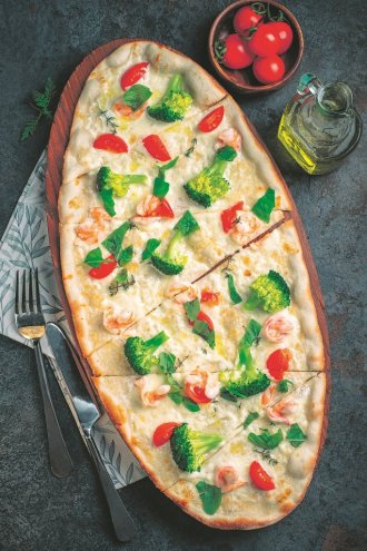 Kvasac razmutiti u vodi sa šećerom, te ostaviti da nadođe. Brašno pomešati sa malo soli, dodati kvasac i ulje, zamesiti testo, te ga ostaviti na toplom da odstoji sat vremena. Potom ga razvaljati, staviti u pleh, odozgo rasporediti rendanu gaudu pomešanu sa pavlakom za kuvanje i origanom, škampe, iseckan brokoli i paradajz, pa peći u rerni na 250 stepeni deset minuta.