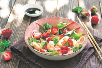 Očišćene repove škampa posoliti i pobiberiti, preliti sa malo ulja, pa kratko propržiti u tiganju na umerenoj vatri, da porumene sa svih strana. Prebaciti u činiju, prohladiti, te dodati na rebarca isečen crni luk, iseckane jagode, spanać i pinjole. Preliti sveže ceđenim sokom od limuna i maslinovim uljem, promešati i odmah poslužiti.