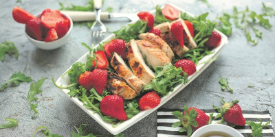 Pileći file iseći na deblje šnicle, posoliti, pobiberiti, začiniti suvim začinom i majčinom dušicom, pa kratko propržiti u tiganju na malo maslinovog ulja, da porumeni sa svih strana. Prebaciti u rernu zagrejanu na 200 stepeni i peći još 20-25 minuta. U međuvremenu rukolu oprati, prosušiti, staviti u činiju, preliti uljem i sirćetom, pa promešati. Odozgo poređati iseckane jagode i na komade isečenu piletinu, pa poslužiti.