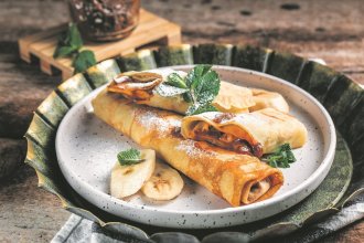 Brašno pomešati sa šećerom i malo soli, dodati mleko, vodu, ulje i jaja, pa sve dobro umutiti, da se dobije ujednačena smesa bez grudvica. Ostaviti da odstoji pola sata, pa ispeći palačinke u tiganju na malo ulja da porumene sa obe strane. Premazati kremom od čokolade i lešnika u tankom sloju, odozgo rasporediti banane isečene na kolutove, urolati i poslužiti.