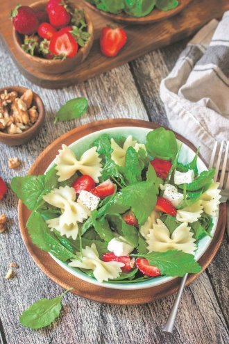 Mašnice skuvati u posoljenoj, ključaloj vodi, prema uputstvu sa pakovanja, pa ocediti, staviti u veću činiju i prohladiti. Dodati iscepkane listove rukole, iseckane jagode, grubo usitnjene orahe, na kockice isečenu gorgonzolu, maslinovo ulje i balzamiko, sve dobro sjediniti, pa odmah poslužiti.