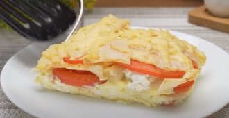 Poređajte još jedan sloj cepkane tortilje. Zatim pospite mrvljeni feta sir i seckani paradajz, pa opet poređajte tortilju.Umutite jaja sa mlekom, pa posolite i pobiberite i prelijte preko pite.