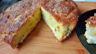 Dodati oba brašna sa praškom za pecivo. Izmešati i izliti u podmazan pleh.