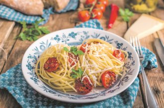 Špagete skuvati u slanoj, ključaloj vodi, prema uputstvu sa pakovanja. Paradajz prepoloviti, staviti u činiju, dodati izgnječeni beli luk, so i biber, preliti uljem, pa rasporediti na pleh obložen papirom za pečenje i peći u rerni na 220 stepeni 11 minuta. Špagete ocediti, staviti u adekvatnu posudu, dodati paradajz, rendani parmezan i peršun, promešati i odmah poslužiti.