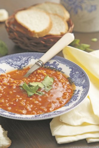 Paradajz oprati, kratko blanširati u ključaloj vodi, odmah prebaciti u ledenu vodu, pa ga oljuštiti i iseći na kockice. Sočivo oprati, staviti u lonac, preliti vodom, pa dodati iseckan crveni i beli luk, krompir, paradajz, peršun i celer. Posoliti, pobiberiti, pošećeriti i začiniti origanom. Kuvati na umerenoj temperaturi oko sat vremena. Pred kraj kuvanja umešati dve kašike maslinovog ulja, pa poslužiti dok je toplo.