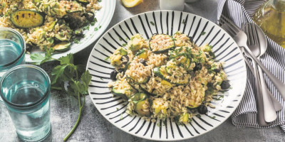 Tikvice oprati, iseći na kolutove, posoliti i pobiberiti, premazati sa malo ulja, te kratko izgrilovati na roštilju ili u gril tiganju. U međuvremenu pirinač skuvati sa tri šolje vode, da omekša i nabubri, pa prohladiti i staviti u činiju. Dodati tikvice, maslinke, kapar, na kockice isečen avokado, ulje, sok od limuna, so i biber, posuti parmezanom, promešati i poslužiti.