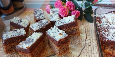 Sve izjednačiti i sipati u podmazan pleh koji ste posuli brašnom. Peći 30 minuta na 180 stepeni da se kolač odvoji od tepsije i porumeni.