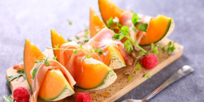 Dinju prepolovite, izvadite semenke, oljuštite i isecite na 12 kriški. Mocarelu takođe isecite na kriške oko centimetar debljine. Oko svake kriške dinje zamotajte po krišku pršute i komad mocarele, pa ih učvrstite čačkalicama. Pre serviranja posolite i pospite maslinovim uljem.