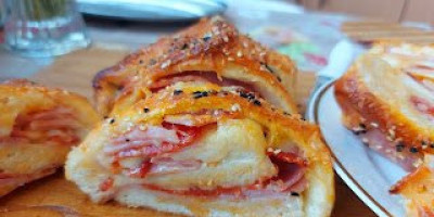 Premažite testo pavlakom, poređajte listove šunke, kačkavalja i listove kulena. Uvite rolat, pa ga okrenite na glatku stranu.