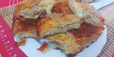 Jaja umutiti malo žicom. Na dno podmazanog pleha staviti koricu tanku, premazati uljem, pa dodati još tri korice tako i na četvrtu staviti pola mesa i krompira. Ide opet četiri kore, pa meso i četiri kore namazane uljem.
