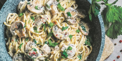 U dublji tiganj sipajte pola kašike maslinovog ulja, dodajte beli luk, kratko prodinstajte (minut), dodajte i iseckane pečurke. Posolite i pobiberite po ukusu, i dinstajte osam minuta, mešajući povremeno. Dodajte skuvanu testeninu i polovinu vode od kuvanja koju ste sačuvali.