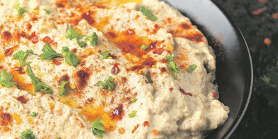 Cele i neoljuštene patlidžane i čenove belog luka ispecite (bez ulja) u rerni na 200 stepeni, oko 30 minuta ili dok ne omekšaju. Prepolovite ohlađene patlidžane i kašikom izvadite unutrašnji, mekani deo. Istisnite mekani deo belog luka. Stavite patlidžane i luk u posudu, pa usitnite štapnim mikserom. Dodajte tahini i jogurt, pa pomešajte. Dodajte limun (sok i koricu) i po potrebi soli. Držite u frižideru nekoliko dana, pokriveno folijom. Poslužite uz krekere ili namažite na prepečeni hleb. Pre posluživanja pospite naseckani peršun i nekoliko kapi maslinovog ulja.