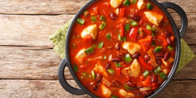Crni i beli luk sitno iseckati. Šargarepu iseći na kolutove, paradajz na kriške, a krompir i papriku na kocke. U većoj šerpi na malo zagrejanog ulja propržiti crni i beli luk, pa dodati meso isečeno na kocke. Dinstati dok piletina ne promeni boju, pa dodati šargarepu i krompir. Naliti vinom i pilećom supom, pa ubaciti oceđen pasulj. Začiniti lovorom i ruzmarinom, te dinstati još desetak minuta. Smesu preručiti u vatrostalnu činiju, pa zapeći pola sata u rerni na 180 stepeni.