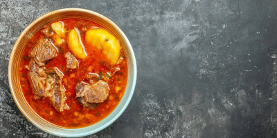 U činiji pomešajte brašno, papriku, seckani timijan, ruzmarin, malo soli i bibera. Uvaljajte kockice mesa u mešavinu brašna i začina i stavite na tanjir. U tiganju zagrejte ulje na srednjoj temperaturi i kratko propržite meso. Očistite i iseckajte šargarepu ili krompir i crni luk i stavite u šerpu. Potom rasporedite meso, stavite seckanu papriku i paradajz, prelijte supom, dodajte beli luk i lovorov list, poklopite i kuvajte nekoliko sati na umerenoj temperaturi dok se meso potpuno ne raskuva.