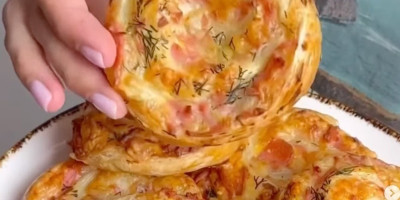Istanjiti lisnato testo, pa pomešati šunku i kačkavalj i posuti po njemu. Dodati i mirođiju, pa urolati i seći na malo deblje kriškice. Svaku potom istanjiti, poređati na tepsiju sa pek papirom, pa premazati mešavinom od žumanaca i mleka.