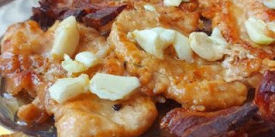 Meso iseći na šnicle i blago ih izlupati između folije. Posoliti posuti začinom za piletinu i izgnječiti 3 čena belog luka.