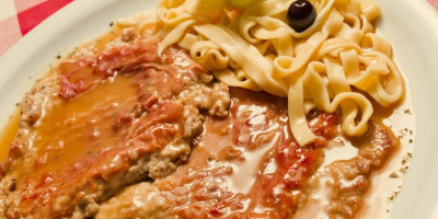Teleće šnicle istanjiti tučkom za meso. Na svako parče mesa staviti po šnitu pršute i list žalfije, pa pričvrstiti čačkalicom. Posoliti i pobiberiti, uvaljati u brašno, pa pržiti u tiganju na vrelom ulju dok teletina ne dobije lepu boju sa obe strane. Izvaditi i staviti na toplo, a u tiganj sipati belo vino i krčkati minut-dva. Vratiti meso, krčkati još minut, pa poslužiti uz testeninu po izboru.