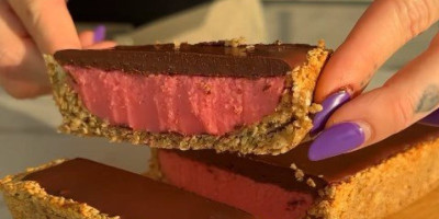Izgnječite bananu, pomešajte sa susamom, rasporedite u kalup sa pečenje i pecite na 180 stepeni, 10 minuta. Izmiksajte jagode, med i jogurt, dodajte želatin, pa ponovo izmiksajte. Prespite u ispečeni kalup i ostavite u frižideru, na 30 minuta. Istopite čokoladu, pomešajte sa kikiriki puterom, pa prelijte odgore. Ponovo ostavite u frižideru da se stegne i vaša poslastica je gotova.