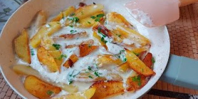 Kad se dobro ugreje, sipati krompir i poklopiti. Smanjiti temperaturu i pržiti. Okrenuti nekoliko puta. U činiju izdrobiti 3-4 čena belog luka i dodati pavlaku i malo origana.