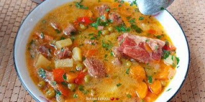 Na ulju propržiti seckan luk i šargarepu , dodati na kocke meso i sipati malo vode. Ubaciti na koscke krompir i grašak.