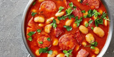 Pasulj staviti u činiju, naliti vodom, pa ostaviti da prenoći. Sutradan ocediti, staviti u šerpu, naliti vodom, pa kuvati dok ne proključa. Opet promeniti vodu, posoliti i kuvati dok pasulj ne omekša. U većem loncu na zagrejanom ulju kratko propržiti iseckan crni luk, pa dodati kobasice isečene na komade i mešati dok ne porumene. Potom dodati beli luk, paradajz, dve šolje vode, papriku, so, biber, origano i bosiljak, pa krčkati još 10-15 minuta. Dodati pasulj i kobasice, kuvati još desetak minuta, pa poslužiti.