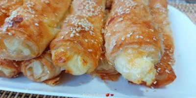 Staviti drugu preko nje pa i nju premazati i u dno staviti 2 kašike sira, Saviti ivice i urolovati.