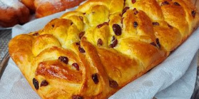 Ostaviti da odmori 30 minuta, pa podeliti na dva dela. Jednu polovinu podeliti na pola, pa razviti u pravougaonik. Premazati margarinom tanko i posuti suvim grožđem koje ste potopili u rum. Uviti u rolat iseći po dužini na 3 trake i isplesti pletenicu.