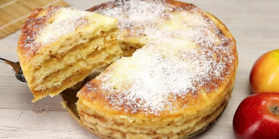 Pomešajte sve suve sastojke i podelite smesu na dva dela. Narendajte jabuke. Kalup prečnika oko 20 cm obložite papirom za pečenje i na dno stavite jedan deo suve smese, pa red jabuka pa drugi red suve smese - i tako dok ne potrošite suvu smesu i jabuke. Poslednji sloj rendanih jabuka prelijte sokom od jabuke, rasporedite poslednji deo suve smese, pa poređajte puter isečen na listiće.Pecite 60 minuta na 180 stepeni. Na kraju kolač pospite šećerom u prahu i poslužite.