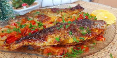 Iseći luk, papriku i paradajz, pa malo posoliti. U trepsiju porđjati i umešan luk, papriku i paradajz poređati odozgo ribu, pa preliti sve preko uljem iz marinade.