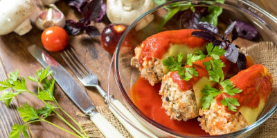Paprikama odstraniti peteljke i semenke, pa ih napuniti pripremljenom smesom. Ređati ih u podmazanu vatrostalnu činiju, preliti preostalim punjenjem, zaliti sokom od paradajza, pa peći na 200 stepeni oko 45 minuta.